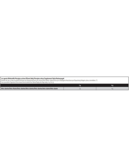 La beta-alanina (2 g per dose) è un aminoacido che si ritiene possa migliorare le capacità fisiche . È anche un precursore della carnosina, un dipeptide che si ritiene aumenti la forza e la resistenza.