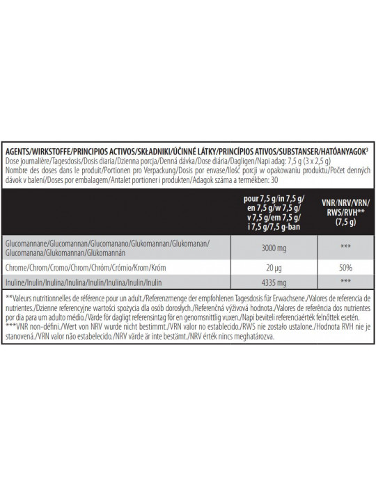 Ingredienti: Inulina 58%, glucomannano 42% (da tubero Amorphophallus konjac)(anidride solforosa), antiagglomerante (biossido di silicio), cromo picolinato (III).