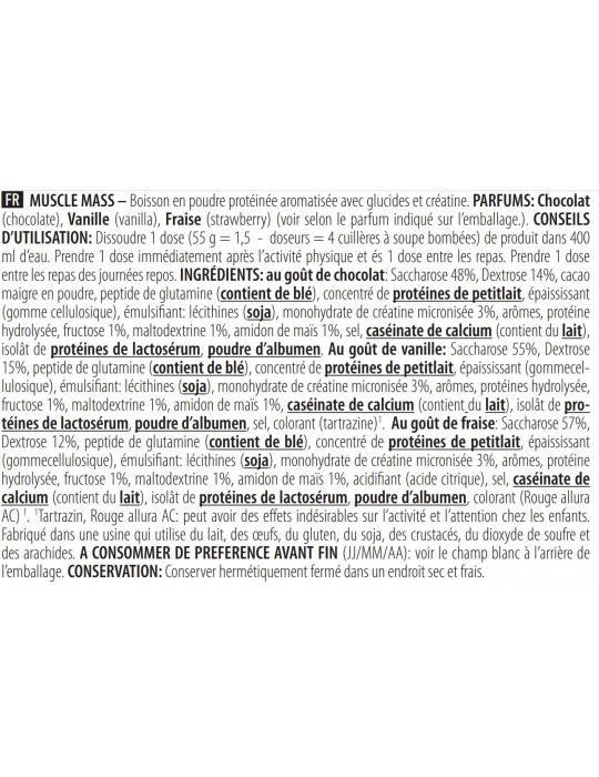 Le diverse proteine (9,4 g) presenti sono: concentrato di siero di latte, proteine idrolizzate, caseina, isolato di siero di latte e albume d'uovo. Si differenziano per il tempo di assorbimento. L'ideale è consumare Muscle Mass dopo l'allenamento, durante il periodo di aumento della massa. Infatti, se si ha difficoltà a ingrassare, è consigliabile non coprire il fabbisogno proteico con un'unica fonte, ma optare per formule complesse composte da proteine con tempi di assorbimento diversi.