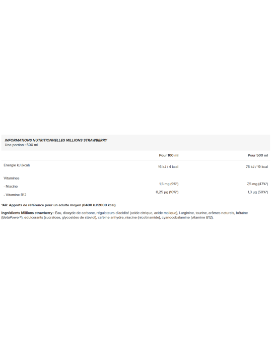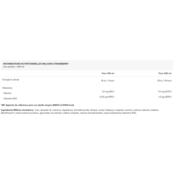 Ingredenti arancioni acqua, diossido di carbonio, regolatori di acidità (acide citrique, acide malique), l-arginina (0,21%), taurina (0,21%), aromi naturali, betaïne (BetaPower®), addolcenti (sucralosio, glicosidi di stéviol), caféine anhydre, niacinamide, cianocobalamina (vitamina B12).