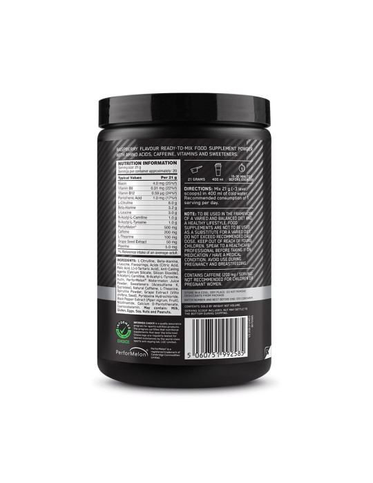 Ingredienti : L-citrullina, beta-alanina, l-leucina, aromi, acidificanti (acido citrico, acido malico, acido L(+)-tartarico), antiagglomeranti (silicato di calcio, biossido di silicio), n-acetil-L-carnitina, n-acetil-L-tirosina, inulina, succo di anguria in polvere (PerforMelon®), edulcoranti (acesulfame-K, sucralosio), caffeina naturale, l-teanina, spirulina in polvere, estratto d'uva (Vitis vinifera, seme), piridossina cloridrato (vitamina B6), estratto di pepe nero (Piper nigrum L., frutto), niacina (nicotinamide), calcio d-pantotenato (vitamina B5), cianocobalamina (vitamina B12).