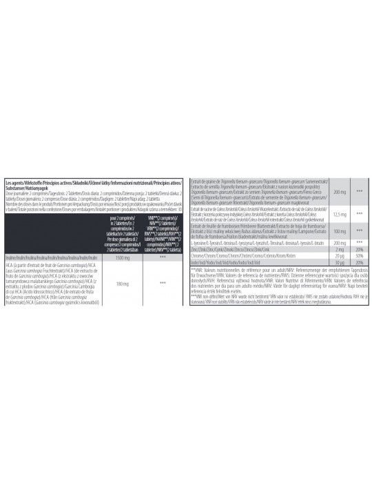 Ingredienti: {stabilisants [copolymère greffé d’alcool polyvinylique et de polyéthylèneglycol, alcool polyvinylique], anti-agglomérants (talc, mono- et diglycérides d’acides gras), colorant (oxydes de fer et hydroxydes de fer)} Inulina 39%, agente di carica (gel di cellulosa), estratto di frutti di Garcinia cambogia 7,7%, estratto di semi di fieno greco (Trigonella foenum-graecum) 6,5%, L-tirosina 5,2%, rivestimento, estratto di radice di coleus indiano (Coleus forskohlii) 3,2%, estratto di foglie di lampone (Rubus idaeus 2,7%, agente antiagglomerante (sali di magnesio degli acidi grassi, biossido di silicio),2%, estratto di foglie di lampone (Rubus idaeus) 2,7%, agente antiagglomerante (sali di magnesio degli acidi grassi, biossido di silicio), ossido di zinco, cloruro di cromo (III), ioduro di potassio.