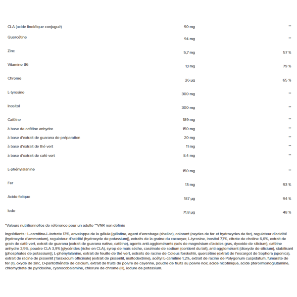 Ingredienti: [gélatine, agent d'enrobage (shellac), colorant (oxydes et hydroxydes de fer), régulateur d'acidité (hydroxyde d'ammonium), régulateur d'acidité (hydroxyde de potassium)] L-Carnitina-L-Tartrato 12,4%, involucro della capsula, estratto di semi di cacao, L-tirosina, inositolo 7,4%, citrato di colina 6,4%, estratto di semi di caffè verde, estratto di semi di guaranà (estratto nativo di guaranà, caffeina), [glycérides (riches en CLA), sirop de maïs séché, caséinate de sodium (contient du lait), anti-agglomérant (dioxyde de silicium), stabilisant (diphosphates)] Agente antiagglomerante (sali di magnesio degli acidi grassi, biossido di silicio), caffeina anidra 3,7%, CLA in polvere 3,7% , estratto del frutto di Garcinia cambogia, L-fenilalanina, estratto di foglie di tè verde, estratto di radice di Coleus forskohlii, quercetina diidrata (estratto di gemme di Sophora japonica), estratto di radice di tarassaco (Taraxacum officinale) (estratto di tarassaco, maltodestrina), acetil-L-carnitina 1,1%, estratto di radice di Polygonum cuspidatum, ferro (II) fumarato, ossido di zinco, calcio D-pantotenato, estratto di frutti di pepe di Caienna, polvere di frutti di pepe nero, acido nicotinico, cloridrato di piridossina, cianocobalamina, acido pteroilmonoglutammico, cloruro di cromo (III), ioduro di potassio