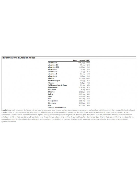 Ingredienti: [gélatine, agent d'enrobage (shellac), colorant (oxydes de fer et hydroxydes de fer), régulateur d'acidité (hydroxyde d'ammonium), régulateur d'acidité (hydroxyde de potassium)] sali di calcio dell'acido ortofosforico, agente di carica (solfato di potassio), involucro della capsula, ossido di magnesio, acido L-ascorbico, acetato di DL-alfa-tocoferolo, agenti antiagglomeranti (sali di magnesio degli acidi grassi, biossido di silicio), carbonato di calcio, nicotinamide, solfato di ferro (II), acetato di retinile, calcio D-pantotenato, ossido di zinco, solfato di rame (II), solfato di manganese, cloridrato di piridossina, colecalciferolo, mononitrato di tiamina, riboflavina, acido pteroilmonoglutammico, D-biotina, cloruro di cromo (III), ioduro di potassio, selenito di sodio, fillochinone, cianocobalamina.