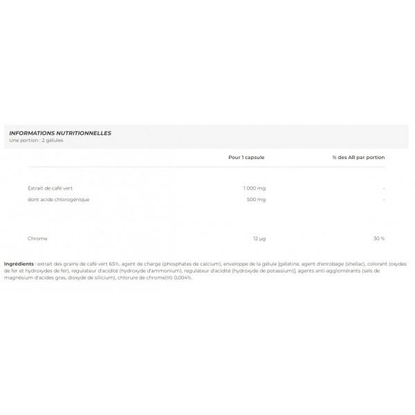 [gélatine, agent d'enrobage (shellac), colorant (oxydes de fer et hydroxydes de fer), régulateur d'acidité (hydroxyde d'ammonium), régulateur d'acidité (hydroxyde de potassium)]Ingredienti: estratto di chicchi di caffè verde 65%, agente di carica (fosfati di calcio), involucro della capsula, agenti antiagglomeranti (sali di magnesio degli acidi grassi, biossido di silicio), cromo(III) cloruro 0,004%.