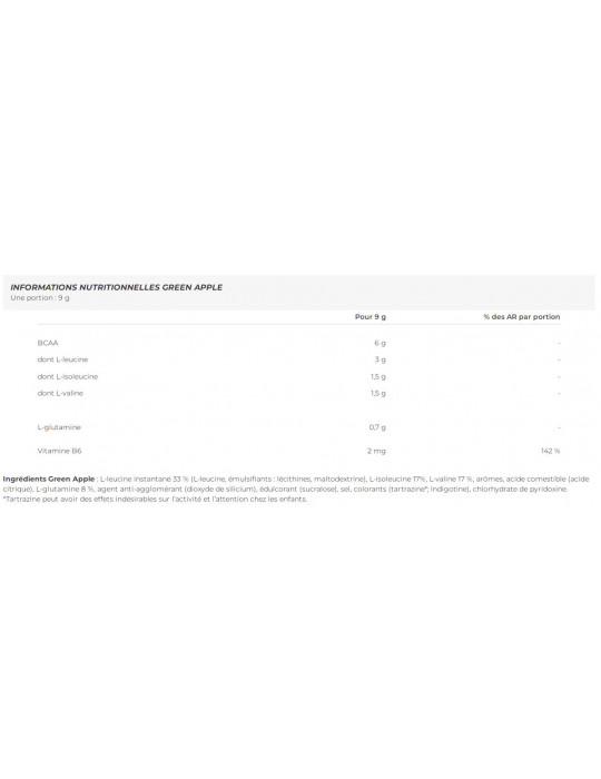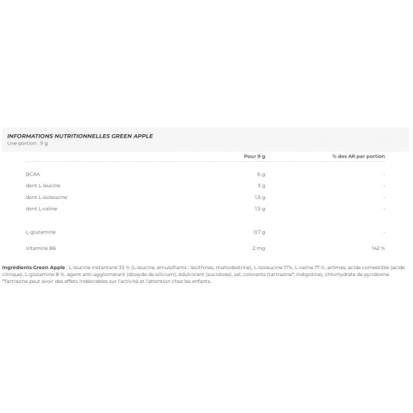 Ingredienti della mela verde: L-leucina istantanea 33% (L-leucina, emulsionanti: lecitina, maltodestrina), L-isoleucina 17%, L-valina 17%, aromi, acido alimentare (acido citrico), L-glutammina 8%, antiagglomerante (biossido di silicio), edulcorante (sucralosio), sale, coloranti (tartrazina*; indigotina), piridossina cloridrato. *La tartrazina può avere effetti negativi sull'attività e l'attenzione dei bambini.