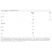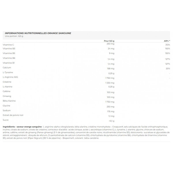 Ingredienti - aroma di arancia rossa l-arginina-alfa-chetoglutarato, beta-alanina, creatina monoidrato - Creapure®, sali di calcio dell'acido ortofosforico, inulina, citrato di sodio, creatina citrato, regolatore di acidità : acido citrico, acido L-ascorbico (vitamina C), L-tirosina, L-alanina, glicina, cloruro di sodio, aroma, caffeina, estratto di ginseng (Panax ginseng) (5% ginsenosidi), concentrato di carota nera, nicotinamide (vitamina B3), edulcoranti : sucralosio e glicosidi steviolici, antiagglomerante: biossido di silicio, calcio D-pantotenato (vitamina B5), piridossina cloridrato (vitamina B6), tiamina cloridrato (vitamina B1), estratto di pepe nero (Piper Nigrum) (95% piperina) - Bioperine®, colorante: beta-carotene.