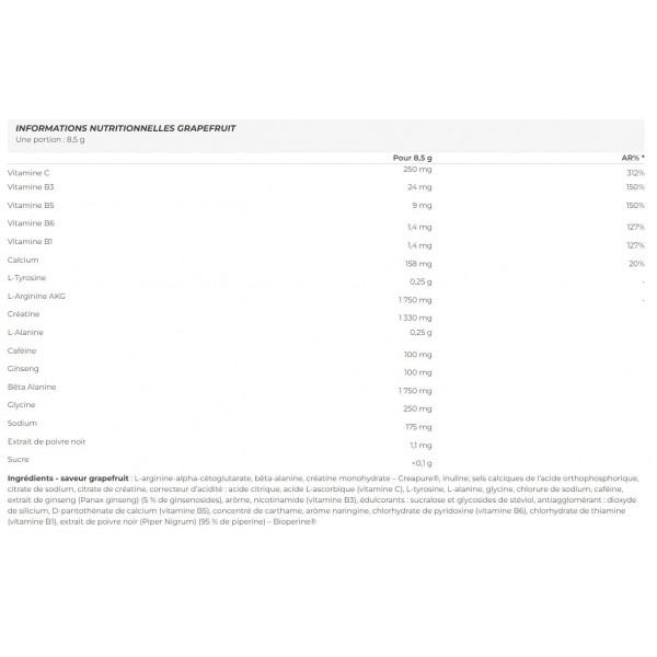 Ingredienti - aroma di pompelmo l-arginina-alfa-chetoglutarato, beta-alanina, creatina monoidrato - Creapure®, inulina, sali di calcio dell'acido ortofosforico, citrato di sodio, creatina citrata, regolatore di acidità : acido citrico, acido L-ascorbico (vitamina C), L-tirosina, L-alanina, glicina, cloruro di sodio, caffeina, estratto di ginseng (Panax ginseng) (5 % ginsenosidi), aroma, nicotinamide (vitamina B3), edulcoranti : sucralosio e glicosidi steviolici, antiagglomerante: biossido di silicio, calcio D-pantotenato (vitamina B5), concentrato di cartamo, aroma di naringina, piridossina cloridrato (vitamina B6), tiamina cloridrato (vitamina B1), estratto di pepe nero (Piper Nigrum) (95 % piperina) - Bioperine®