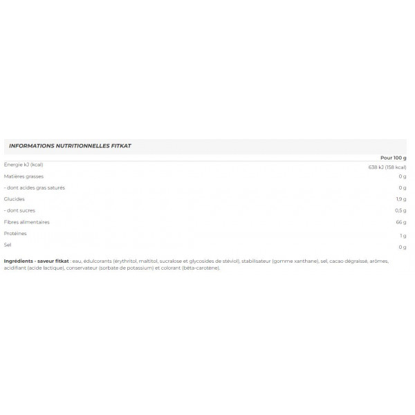 Ingredienti - gusto fitkat: acqua, edulcoranti (eritritolo, maltitolo, sucralosio e glicosidi steviolici), stabilizzante (gomma xantana), sale, cacao magro, aromi, acidificante (acido lattico), conservante (sorbato di potassio) e colorante (beta-carotene).