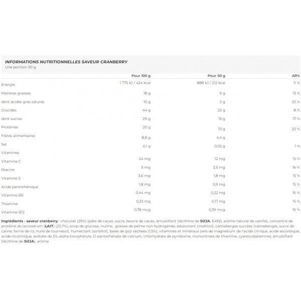 Ingredienti - aroma di mirtillo rosso cioccolato (25%) (pasta di cacao, zucchero, burro di cacao, emulsionante (lecitina di cacao))SOJA, e492), aroma naturale di vaniglia), concentrato di proteine da LATTOSERIO (LATTE) (23,7%), sciroppo di glucosio, inulina, grasso di palma non idrogenato, edulcorante (maltitolo), mirtilli rossi zuccherati (mirtilli rossi, zucchero di canna, farina di riso, olio di girasole), umettante (sorbitolo), bacche di goji essiccate (1,5%), vitamine e minerali (sali di magnesio dell'acido citrico, acido ascorbico, acido nicotinico, acetato di DL-alfa-tocoferile, pantotenato di D-calcio, cloridrato di piridossina, mononitrato di tiamina, cianocobalamina), emulsionante (lecitina di potassio)SOJA), aroma.