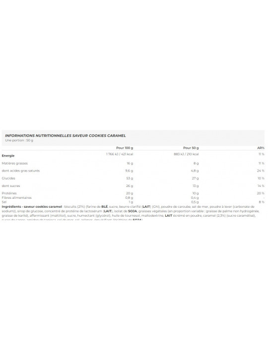 Ingredienti - gusto biscotto al caramello: biscotti (21%) [farina di GRANO, zucchero, burro chiarificato(LATTE) (GHE), polvere di carrube, sale marino, agente lievitante (carbonato di sodio)], sciroppo di glucosio, concentrato proteico di LATTOSERUM(LATTE), isolato di soia, grassi vegetali (in proporzione variabile : grasso di palma non idrogenato, grasso di karité), agente rassodante (maltiitolo), zucchero, umettante (glicerolo), olio di girasole, maltodestrina, LATTE scremato in polvere, caramello (2,3%) (zucchero caramellato), zucchero di canna, amido di tapioca, sale marino, sale, aromi, emulsionante (lecitina di SOIA)