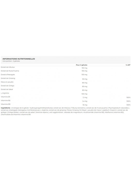 Ingredienti: involucro della capsula : idrossipropilmetilcellulosa, estratto secco di tribulus ( Tribulus terrestris ), estratto secco di muira puama ( Ptychopetalum olacoides ), estratto secco di astragalo ( Astragalus membranaceus ), L-arginina, estratto secco di ginseng ( Panax Ginseng CA Meyer ), polvere di maca ( Lepidium meyenii ), estratto secco di ginkgo ( Ginkgo biloba ), estratto secco di sabal ( Serenoa repens ), antiagglomerante : stearato di magnesio, nicotinamide (vitamina B3), riboflavina (vitamina B2), cloridrato di tiamina (vitamina B1).