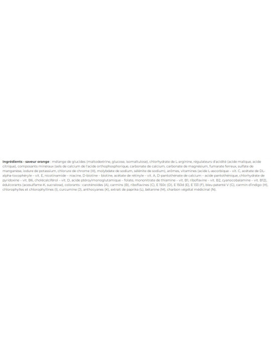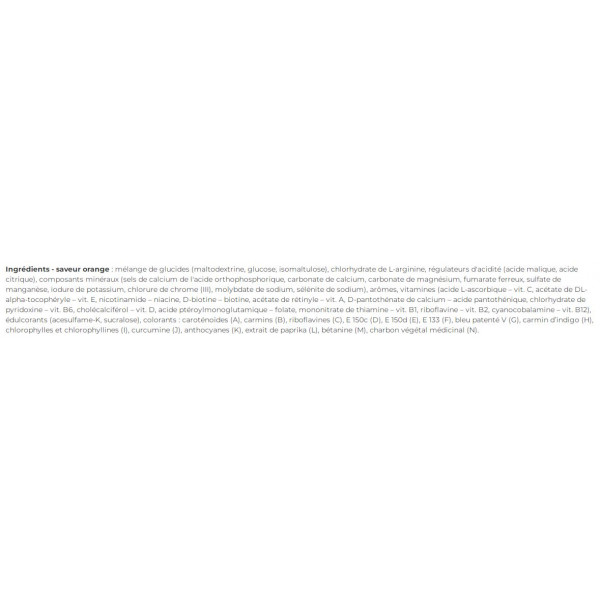 Ingredienti - aroma di arancia: miscela di carboidrati (maltodestrina, glucosio, isomaltulosio), L-arginina cloridrato, regolatori di acidità (acido malico, acido citrico), componenti minerali (sali di calcio dell'acido ortofosforico, carbonato di calcio, carbonato di magnesio, fumarato ferroso, solfato di manganese, ioduro di potassio, cloruro di cromo (III), molibdato di sodio, selenito di sodio), aromi, vitamine (acido L-ascorbico - vit. C, acetato di DL-alfa-tocoferile - vit. E, nicotinamide - niacina, D-biotina - biotina, acetato di retinile - vit. A, D-pantotenato di calcio - acido pantotenico, cloridrato di piridossina - vit. B6, colecalciferolo - vit. D, acido pteroilmonoglutammico - folato, tiamina mononitrato - vit. B1, riboflavina - vit. B2, cianocobalamina - vit. B12), edulcoranti (acesulfame-K, sucralosio), coloranti : carotenoidi (A), carminio (B), riboflavine (C), E 150c (D), E 150d (E), E 133 (F), blu patentato V (G), indaco carminio (H), clorofille e clorofilline (I), curcumina (J), antociani (K), estratto di paprika (L), betanina (M), carbone di piante medicinali (N).