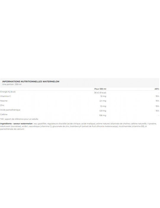 Ingredenti - saveur anguria : acqua gassata, regolatori di acidità (acido citrico, acido malico), arancio naturale, bitartrato di colina, caffeina naturale, l-tirosina, edulcorante (sucralosio), acido L-ascorbique (vitamina C), gluconato di zinco, brainberry® (estratto del frutto di Aronia melanocarpa), nicotinamide (vitamina B3), d-pantotenato di calcio.