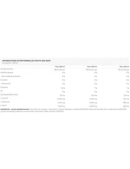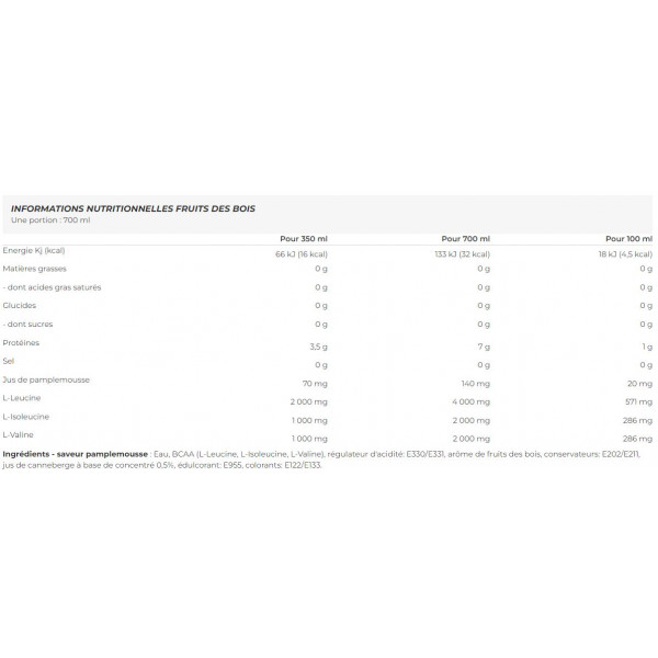 Ingredienti - gusto frutti di bosco: acqua, BCAA (L-leucina, L-isoleucina, L-valina), regolatore di acidità: E330/E331, gusto frutti di bosco, conservanti: E202/E211, succo concentrato di mirtillo rosso 0,5%, edulcorante: E955, coloranti: E122/E133.