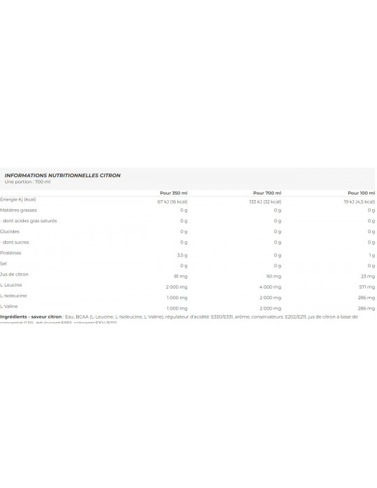 Ingredienti - Aroma limone : acqua, BCAA (L-leucina, L-isoleucina, L-valina), regolatore di acidità: E330/E331, aroma, conservanti: E202/E211, succo di limone concentrato 0,5%, edulcorante: E955, coloranti: E104/E110