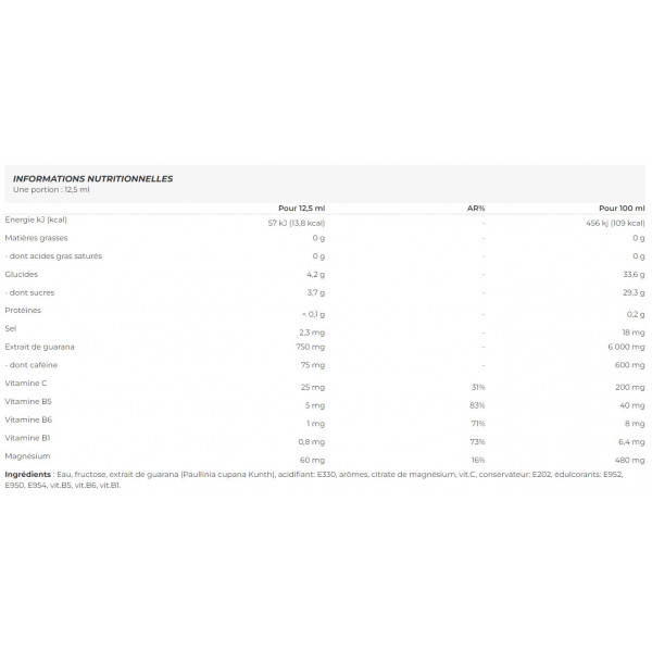Ingredienti: Acqua, fruttosio, estratto di guaranà (Paullinia cupana Kunth), acidificante: E330, aromi, citrato di magnesio, vitamina C, conservante: E202, edulcoranti: E952, E950, E954, vit.B5, vit.B6, vit.B1.