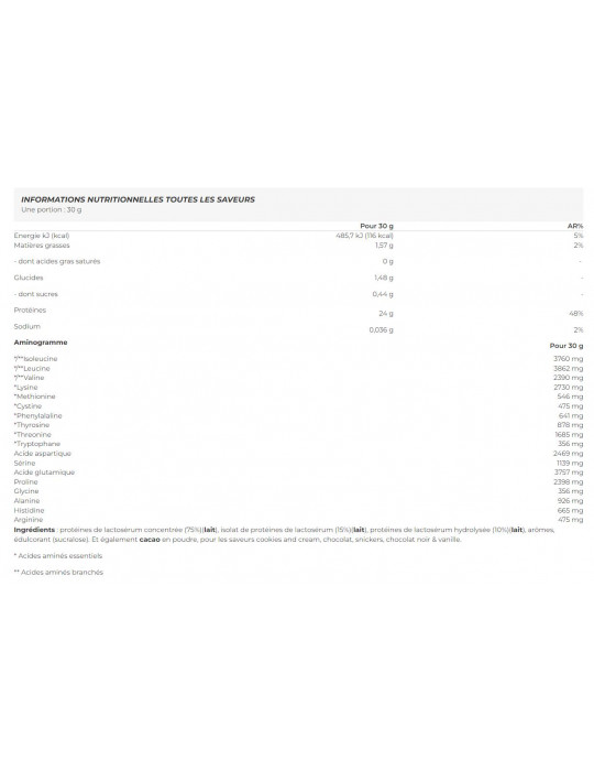 Ingredienti: proteine del siero di latte concentrate (75%)(latte), proteine del siero di latte isolate (15%)(latte), proteine del siero di latte idrolizzate (10%)(latte), aromi, edulcorante (sucralosio). E anche cacao in polvere, per i gusti cookies and cream, cioccolato, snickers, cioccolato fondente e vaniglia.