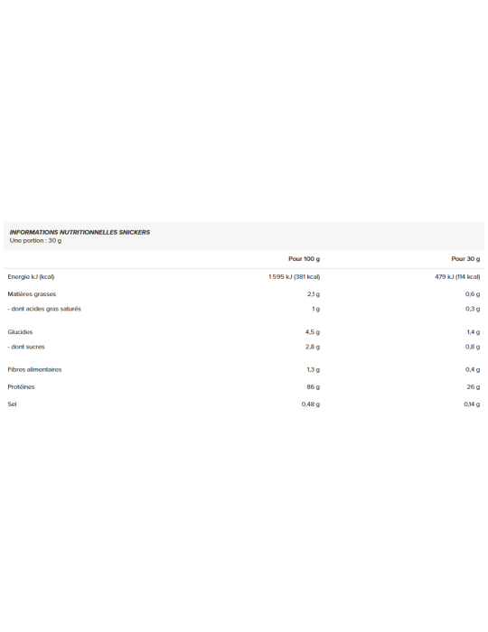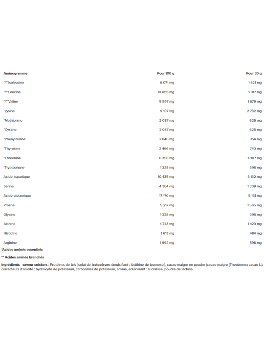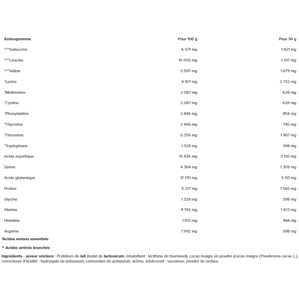 Ingredienti - Gusto Snickers siero di latte isolato (latte), aromi, cacao in polvere, edulcorante: sucralosio, sale.