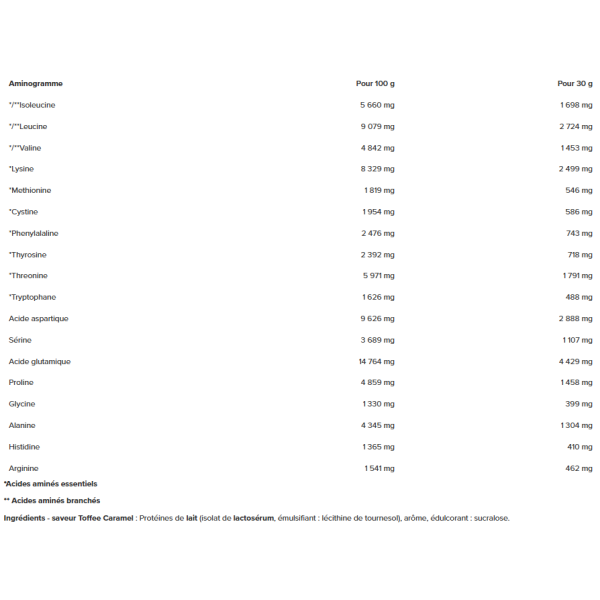 Si possono trovare fino all'88% di proteine, a seconda del gusto, che contribuiscono al mantenimento e allo sviluppo della massa muscolare. Offre inoltre una quantità significativa di BCAA, contenenti i 3 aminoacidi essenziali L-leucina, L-isoleucina e L-valina, che vi aiuteranno nella sintesi proteica, nella costruzione muscolare e nel recupero. Sono presenti anche la glutammina e l'acido glutammico, che aiutano a costruire le proteine.