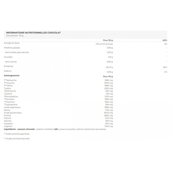 Ingredienti - Gusto cioccolato caseina micellare (latte), cacao in polvere, aromi, edulcorante (sucralosio).