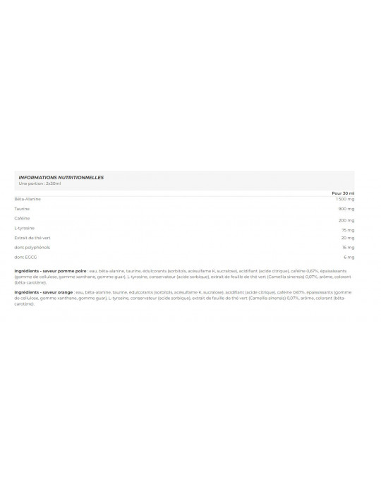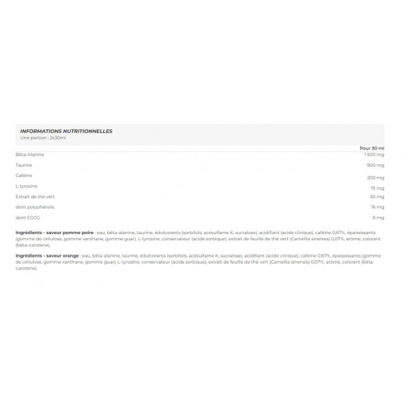 Ingredienti - Gusto mela-pera: acqua, beta-alanina, taurina, edulcoranti (sorbitoli, acesulfame K, sucralosio), acidificante (acido citrico), caffeina 0,67%, addensanti (gomma di cellulosa, gomma di xanthan, gomma di guar), L-tirosina, conservante (acido sorbico), estratto di foglie di tè verde (Camellia sinensis) 0,07%, aroma, colorante (beta-carotene).