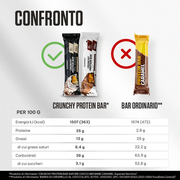 Ingredienti Choco Brownie Caramel : cioccolato al latte intero con edulcorante (edulcorante (maltitolo), burro di cacao, latte intero in polvere, pasta di cacao, emulsionante (lecitina), aroma naturale di vaniglia bourbon) 26,7%, proteine del latte (isolato di siero, caseinato di calcio), ripieno al caramello (agente di carica (polidestrosio), edulcorante (maltitolo), grasso vegetale non idrogenato (olio di cocco, burro di karité), burro di cacao, colorante alimentare (concentrato di mela e ibisco), emulsionante (lecitina), sale, aroma naturale) 12,5%, umettante (glicerolo), proteine del latte (proteine del latte, idrolizzato di proteine del latte), crispies di proteine di soia (isolato di proteine di soia, cacao in polvere, amido di tapioca) 8,33%, idrolizzato di collagene (bovino), acqua, cioccolato fondente con edulcorante (pasta di cacao, edulcorante (maltitolo), burro di cacao, emulsionante (lecitina), aroma naturale di vaniglia bourbon) 2,50%, cacao magro in polvere, aroma, cellulosa microcristallina, sale.