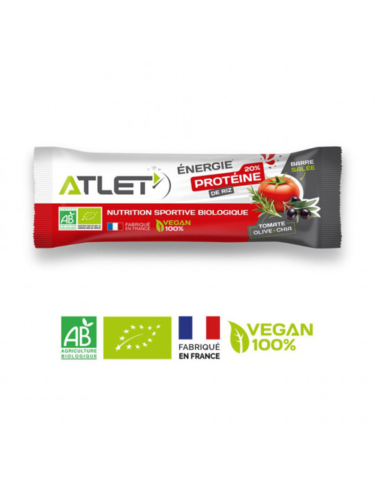 AtletLa barretta proteica salata di è una barretta energetica formulata con materie prime100% biologiche, selezionate con cura e con l'esclusione di ingredienti come additivi, conservanti, riempitivi, ecc. Il processo di produzione a meno di 42°C preserva tutte le qualità nutrizionali degli ingredienti. Atlet Il marchio vuole rimanere concentrato sull'essenziale: la performance e il piacere di mangiare per gli sportivi!