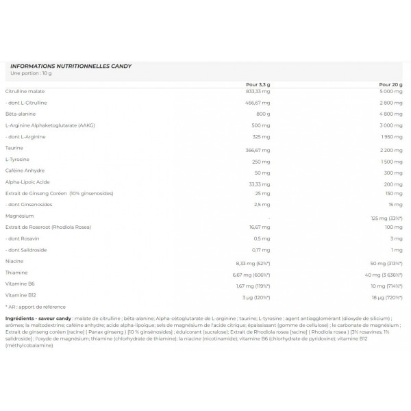Ingredienti - gusto caramella: citrullina malato; beta-alanina; L-arginina alfa-chetoglutarato; taurina; L-tirosina; agente antiagglomerante (biossido di silicio); aromi; maltodestrina; caffeina anidra; acido alfa-lipoico; sali di magnesio dell'acido citrico; addensante (gomma di cellulosa); [racine] [10 % ginsénosides] [racine] [3% rosavines, 1% salidroside] carbonato di magnesio; estratto di ginseng coreano (Panax ginseng); edulcorante (sucralosio); estratto di rodiola rosea (Rhodiola rosea); ossido di magnesio; tiamina (tiamina cloridrato); niacina (nicotinamide); vitamina B6 (piridossina cloridrato); vitamina B12 (metilcobalamina)