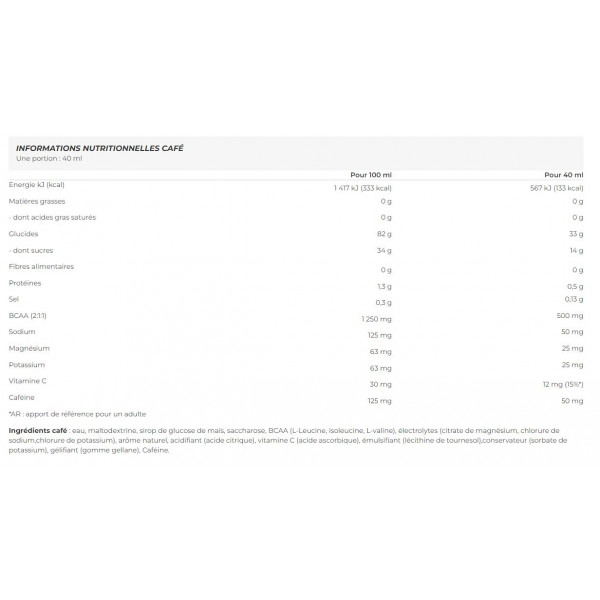 Ingredienti del caffè acqua, maltodestrina, sciroppo di glucosio da mais, saccarosio, BCAA (L-leucina, isoleucina, L-valina), elettroliti (citrato di magnesio, cloruro di sodio, cloruro di potassio), aroma naturale, acidificante (acido citrico), vitamina C (acido ascorbico), emulsionante (lecitina di girasole), conservante (sorbato di potassio), gelificante (gomma di gellano), caffeina.