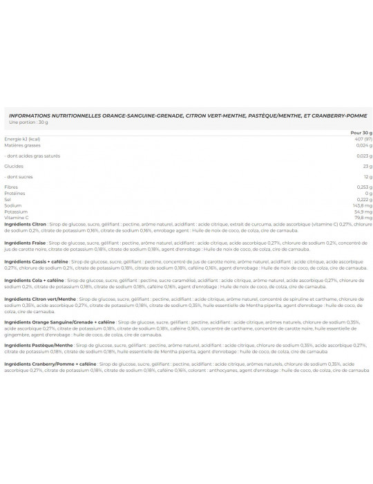 Ingredienti Ribes nero + caffeina: sciroppo di glucosio, zucchero, gelificante: pectina, succo concentrato di carota nera, aroma naturale, acidificante: acido citrico, acido ascorbico 0,27%, cloruro di sodio 0,2%, citrato di potassio 0,18%, citrato di sodio 0,18%, caffeina 0,16%, agente di rivestimento: olio di cocco, olio di colza, cera di carnauba.