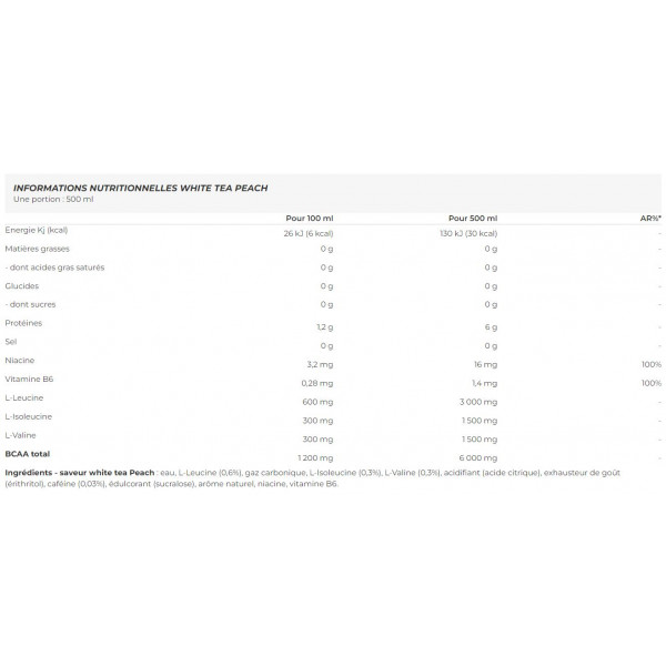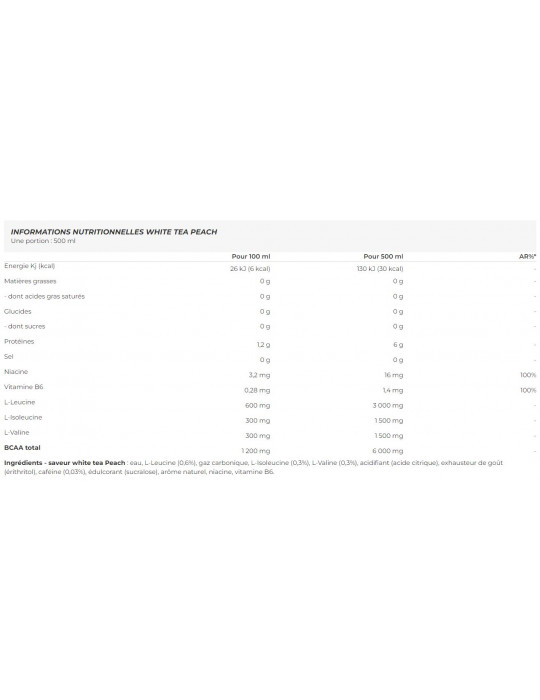 Ingredienti - Tè bianco gusto pesca: acqua, L-leucina (0,6%), anidride carbonica, L-isoleucina (0,3%), L-valina (0,3%), acidificante (acido citrico), esaltatore di sapidità (eritritolo), caffeina (0,03%), edulcorante (sucralosio), aroma naturale, niacina, vitamina B6.