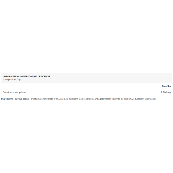 Ingredienti - gusto ciliegia : creatina monoidrato (94%), aromi, acidificante (acido citrico), antiagglomerante (biossido di silicio), edulcorante (sucralosio)