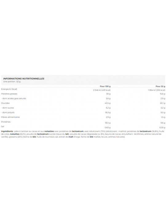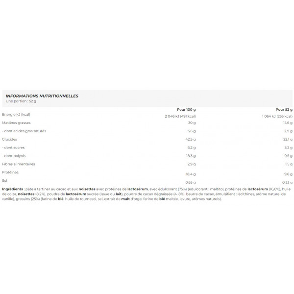 Ingredienti: crema spalmabile al cacao e nocciole con proteine del siero di latte, con edulcorante (75%) (edulcorante: maltitolo, proteine del siero di latte (16,8%), olio di colza, nocciole (8,2%), siero di latte dolce in polvere (da latte), cacao sgrassato in polvere (4. 8%), burro di cacao, emulsionante: lecitine, aroma naturale di vaniglia), grissini (25%) (farina di frumento, olio di girasole, sale, estratto di malto d'orzo, farina di frumento maltato, lievito, aromi naturali).