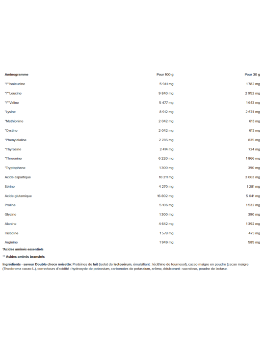 Ingredienti - doppio cioccolato gusto nocciolaSiero di latte isolato (latte), aromi, cacao in polvere, edulcorante: sucralosio, sale.
