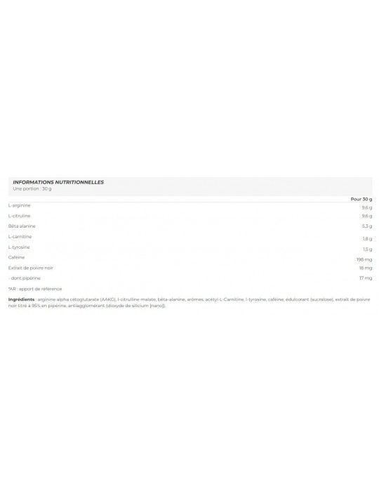 [nano]Ingredienti: arginina alfa-chetoglutarato (AAKG), l-citrullina malato, beta-alanina, aromi, acetil-L-carnitina, l-tirosina, caffeina, edulcorante (sucralosio), estratto di pepe nero con il 95% di piperina, antiagglomerante (biossido di silicio).