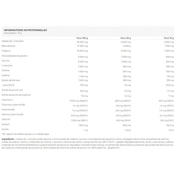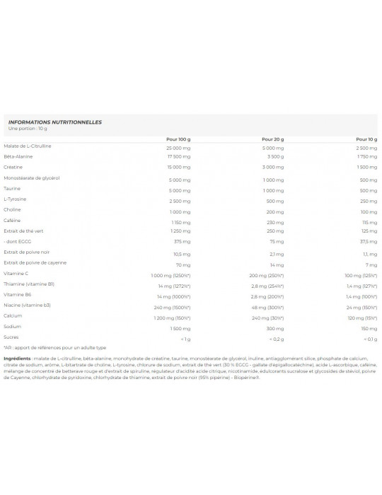 Ingredienti: l-citrullina malato, beta-alanina, creatina monoidrato, taurina, glicerolo monostearato, inulina, antiagglomerante siliceo, fosfato di calcio, citrato di sodio, aroma, colina L-bitartrato, L-tirosina, cloruro di sodio, estratto di tè verde (30 % EGCG - epigallocatechina gallato), acido L-ascorbico, caffeina, miscela di concentrato di barbabietola rossa ed estratto di spirulina, regolatore di acidità acido citrico, nicotinamide, edulcoranti sucralosio e glicosidi steviolici, pepe di Cayenna, cloridrato di piridossina, cloridrato di tiamina, estratto di pepe nero (95% piperina) - Biopérine®.