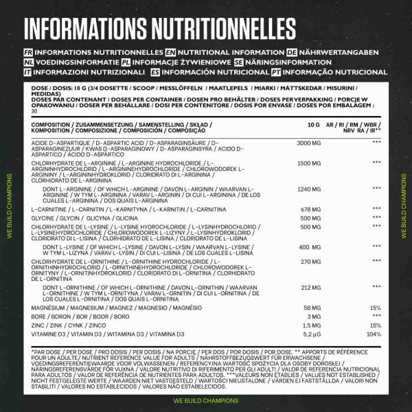 Questa formula avanzata combina aminoacidi essenziali, vitamine e minerali per sostenere la funzione muscolare, aumentare il metabolismo energetico e mantenere i normali livelli di testosterone.