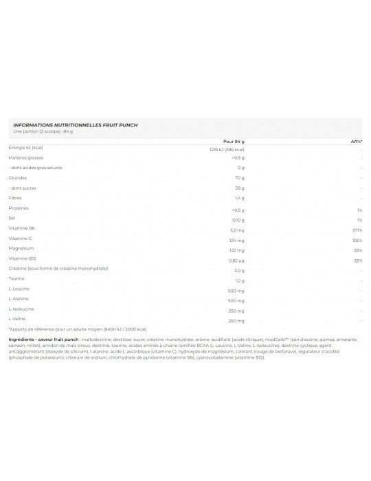 Ingredienti - Gusto punch alla frutta: maltodestrina, destrosio, zucchero, creatina monoidrato, aroma, acidificante (acido citrico), modCarb™ (crusca d'avena, quinoa, amaranto, grano saraceno, miglio), amido di mais ceroso, destrina, taurina, aminoacidi a catena ramificata BCAA (L-leucina, L-valina, L-isoleucina), destrina ciclica, antiagglomerante (biossido di silicio), l-alanina, acido L-ascorbico (vitamina C), idrossido di magnesio, colorante (rosso barbabietola), correttore di acidità (fosfato di potassio), cloruro di sodio, cloridrato di piridossina (vitamina B6), cianocobalamina (vitamina B12).
