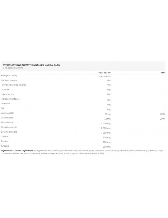 Ingredienti - aroma di laguna bluAcqua gassata, beta-alanina, citrullina malato, betaina anidra, acidificante (acido citrico), aroma naturale, edulcorante (sucralosio), acetil L-tirosina, caffeina, taurina, conservante (sorbato di potassio), niacina, cianocobalamina (vitamina B12).