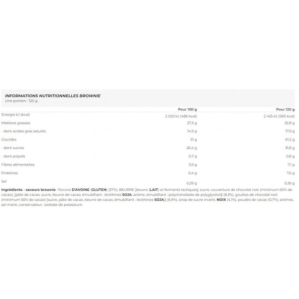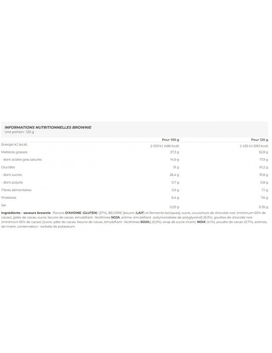 Ingredienti - gusto brownie : fiocchi d'avena(GLUTINE) (37%), BURRO [burro(LATTE) e fermenti lattici], zucchero, copertura di cioccolato fondente (minimo 60% di cacao), [pasta di cacao, zucchero, burro di cacao, emulsionante: lecitine di SOIA, aroma, emulsionante: poliricinoleato di poliglicerolo] (8,3%), gocce di cioccolato fondente (minimo 65% di cacao) [zucchero, pasta di cacao, burro di cacao, emulsionante: lecitine di SOIA] (6,9%), sciroppo di zucchero invertito, NOCCIOLE (4,1%), cacao in polvere (0,7%), aromi, sale marino, conservante: sorbato di potassio.