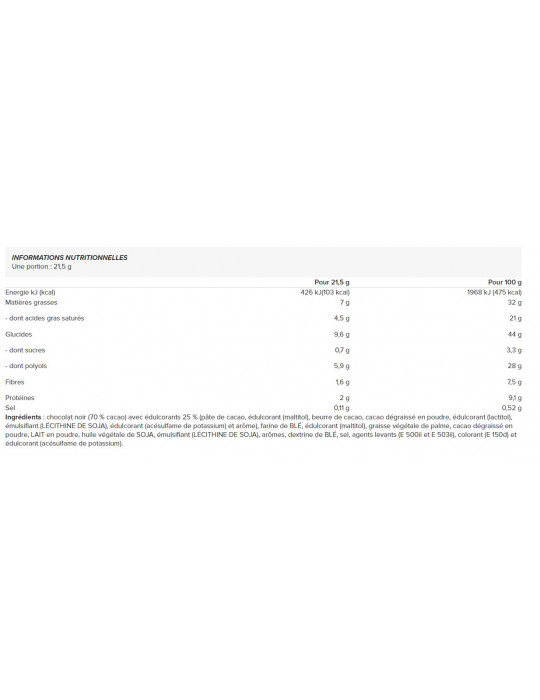 Ingredienti: cioccolato fondente (70% cacao) con edulcoranti 25% (pasta di cacao, edulcorante (maltitolo), burro di cacao, cacao sgrassato in polvere, edulcorante (lattitolo), emulsionante (lecitina di soia), edulcorante (acesulfame di potassio) e aromi), farina di GRANO, edulcorante (maltitolo), grasso vegetale di palma, cacao sgrassato in polvere, LATTE in polvere, olio vegetale di soia, emulsionante (lecitina di soia), aromi, destrina di frumento, sale, agenti lievitanti (E 500ii ed E 503ii), colorante (E 150d) ed edulcorante (acesulfame di potassio).