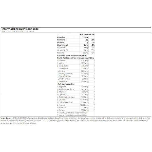 Ingredienti : CARNIVOR 100% Complesso di Aminoacidi di Manzo (Isolato di Proteine di Manzo, Concentrato di Albumina di Manzo, Isolato di Immunoglobuline di Manzo, Fegato di Manzo essiccato), Creatina Monoidrato, GKG (Glutammina (Alfa-Ketoglutarato), KIC (Alfa-Ketoisocaproato), Di-Calcio Fosfato, Cellulosa Microcristallina, Acido Stearico, Magnesio Stearato.