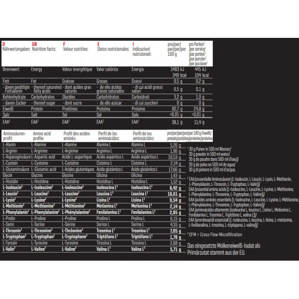 La particolarità di questo siero di latte chiaro è l'elevato contenuto di aminoacidi essenziali(EAA), per un totale di 11.400 mg a seconda del gusto. Questi aminoacidi comprendono L-leucina, L-isoleucina e L-valina, che svolgono un ruolo cruciale in vari processi metabolici, come la sintesi proteica. Gli aminoacidi sono inoltre essenziali per un recupero ottimale dopo lo sforzo fisico.