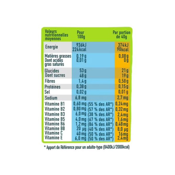 Ingredienti: ribes nero (purea e succo) 40%, zucchero, sciroppo di glucosio-fruttosio, barbabietola 10%, gelificante: pectine di frutta, addensante: farina di semi di carrube, succo concentrato di acerola, succo concentrato di limone, vitamine (B1, B2, B3, B5, B6, B8, E).