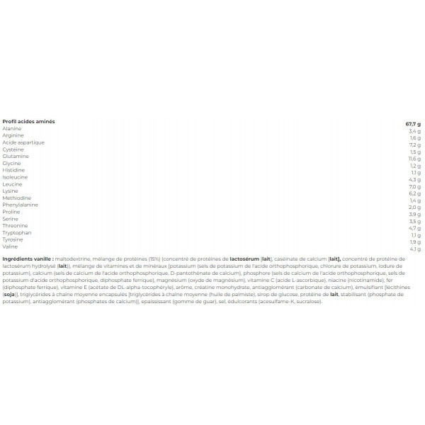 Ingredienti della vaniglia : maltodestrina, miscela proteica (15%) ( proteine del siero del latte concentrate[latte], caseinato di calcio[latte], proteine del siero del latte concentrate idrolizzate(latte)), miscela vitaminica e minerale [potassio (sali di potassio dell'acido ortofosforico, cloruro di potassio, ioduro di potassio), calcio (sali di calcio dell'acido ortofosforico, calcio D-pantotenato), fosforo (sali di calcio dell'acido ortofosforico, sali di potassio dell'acido ortofosforico, difosfato ferrico), magnesio (ossido di magnesio), vitamina C (acido L-ascorbico), niacina (nicotinamide), ferro (difosfato ferrico), vitamina E (acetato di DL-alfa-tocoferile), aromi, creatina monoidrato, antiagglomerante (carbonato di calcio), emulsionante (lecitina(soia)), trigliceridi a catena media incapsulati [trigliceridi a catena media (olio di palma), sciroppo di glucosio, proteine del latte, stabilizzante (fosfato di potassio), antiagglomerante (fosfati di calcio)], addensante (gomma di guar), sale, edulcoranti (acesulfame-K, sucralosio).
