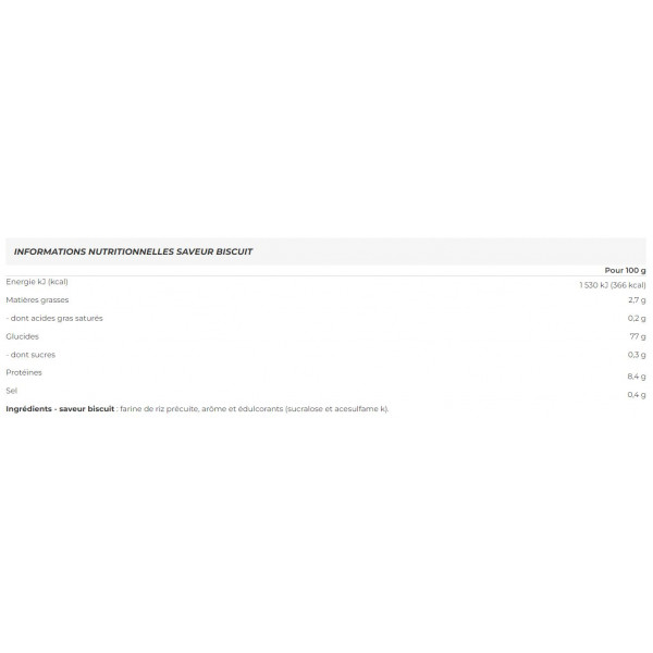 Ingredienti - Gusto biscotto: farina di riso precotta, aromi ed edulcoranti (sucralosio e acesulfame k).
