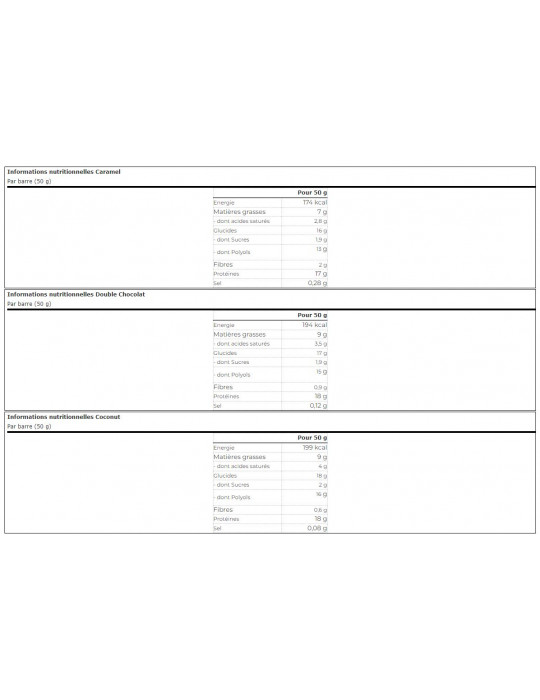 Ingredienti Noce di cocco proteine latte concentrato al 22%, copertura al cioccolato con latte con edulcorante (17%) (edulcorante: maltitolo; burro di cacao), latte polvere integrale cacao, cacao magro in polvere, emulsionante: lecitina di girasole; aroma), edulcorante: maltitolo; pasta di caramello 12% [addensante: polidestrosio; edulcorante: maltitolo; latte concentrato (latte concentrato, zucchero) noce di cocco, stabilizzante: glicerolo; burro di cacao, emulsionante: lecitina di girasole; sale, stabilizzante: pectine; colorante: caramello semplice; aroma naturale], peptidi di collagene idrolizzati 11%, umettante: glicerolo; olio di colza, acqua, croccantini proteici di latte 3,5% (proteine da latte, fecola di patate), addensante: gomma arabica; emulsionante: mono e digliceridi degli acidi grassi; sale 0,4%, conservante: sorbato di potassio; aromi, antiossidante: estratto di tocoferolo.