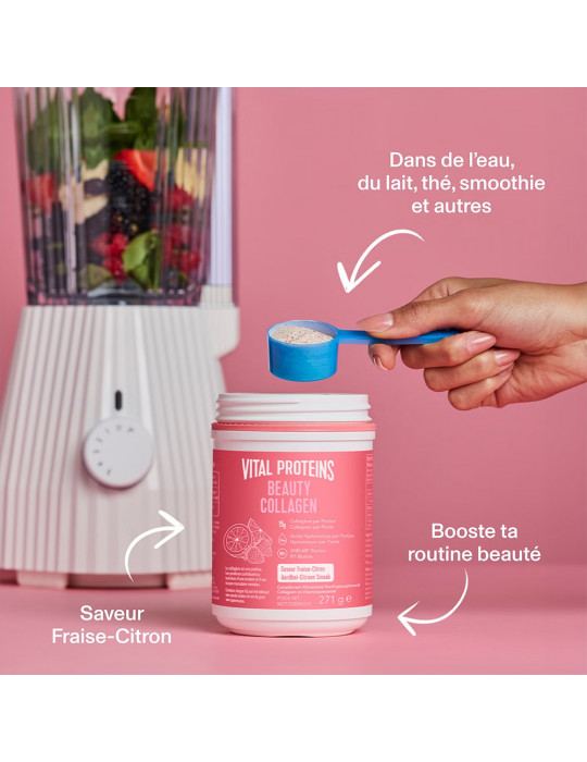 Disponibile nel rinfrescante gusto Fragola e Limone, Beauty Collagen offre un'esperienza rivitalizzante dall'interno, per una bellezza radiosa all'esterno!