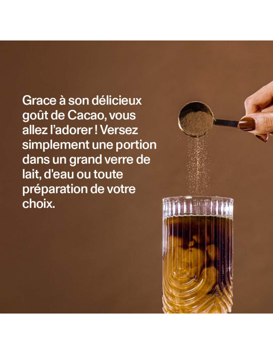 Questa deliziosa polvere al gusto di cioccolato è facile da aggiungere alle vostre bevande calde o fredde, per una dose di benessere ogni giorno.